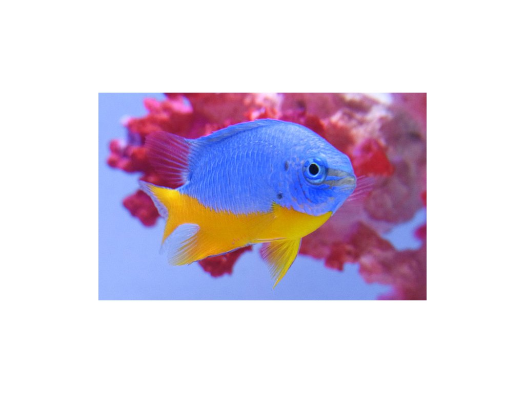 "Sapín žltomodrý žije hlavne pri Šalamúnových ostrovoch, Novej Guiney, Filipínach, Zadnej Indie a južnom Japonsku. Dorastá dĺžky len 5-6 cm. Na niektorých lokalitách (napr. Na Novej Guinei) rybám chýba žlté sfarbenie: príslušne časti tela sú priesvitne belavé. Obýva lagúny a pobrežné koralové riffy od 1 do 16 m hĺbky. Žije v malých skupinách. Planktón lovia väčšinou 30-50 cm nad dnom.