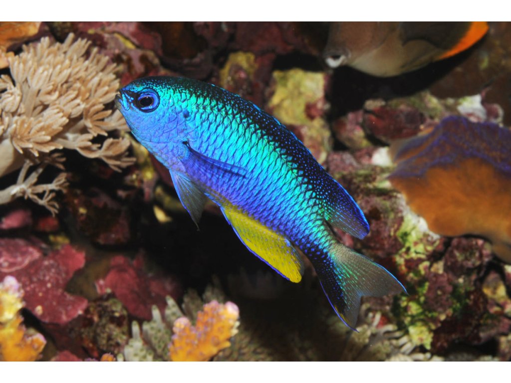 - Farba: Pomacentrus alleni sa vyznačuje žiarivo modrým telom s jemnými žltými akcentmi na plutvách.